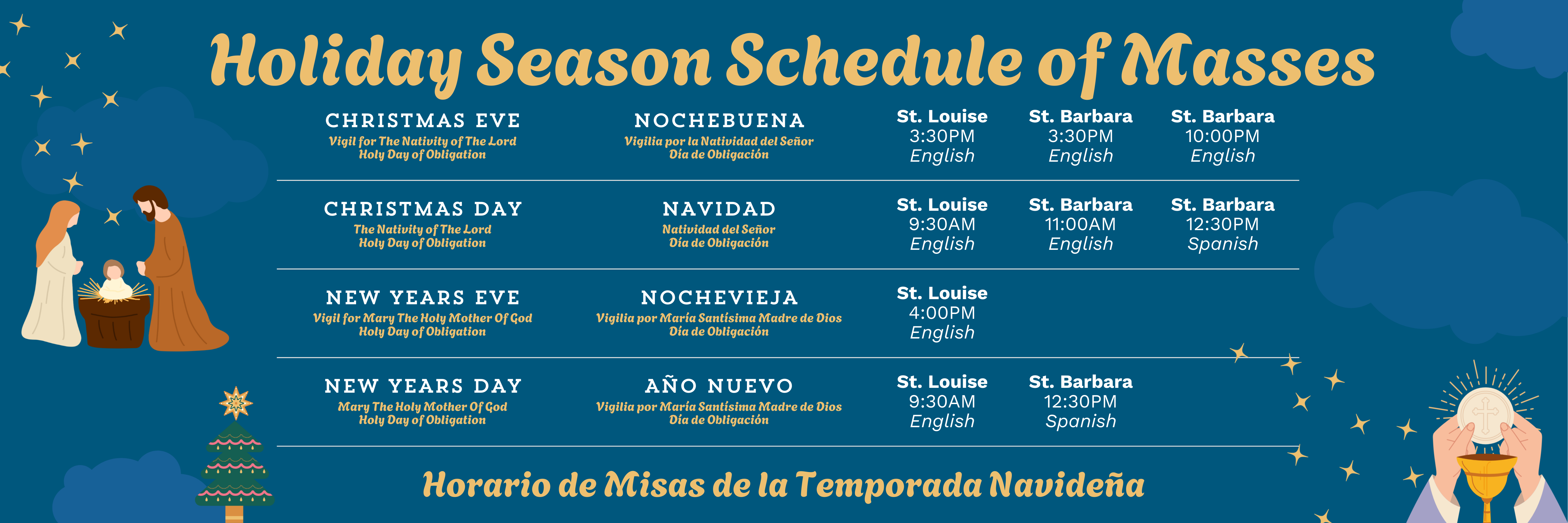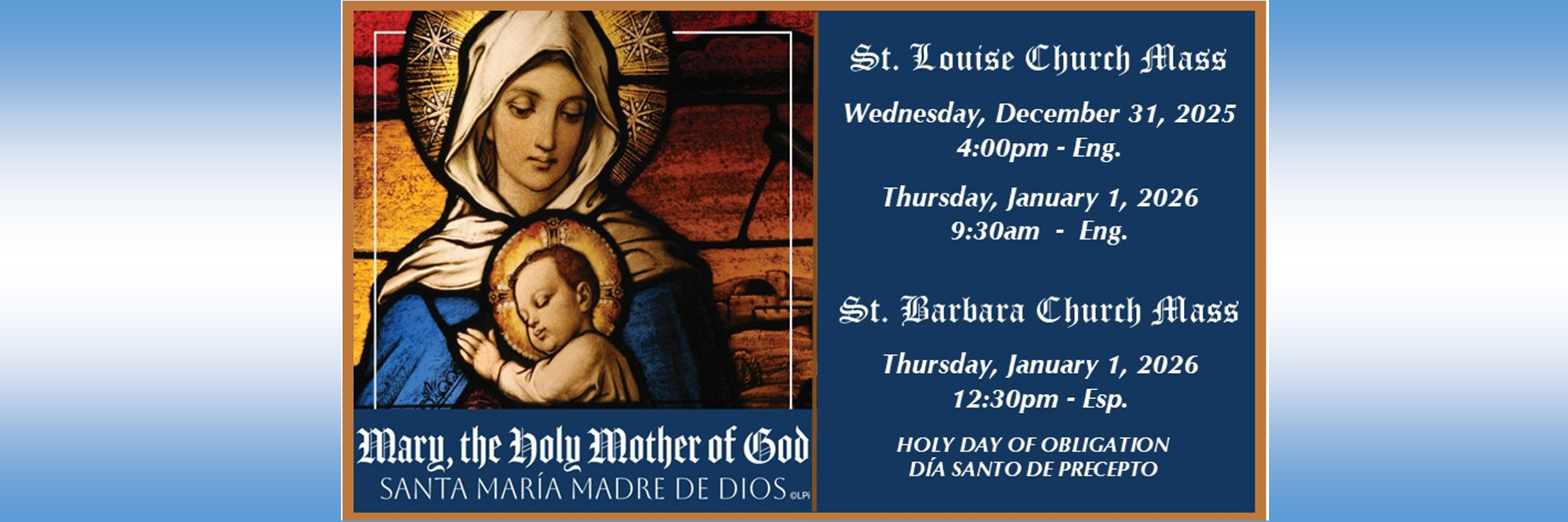 MASS SCHEDULE- St. Louise: Sat. 5pm, Sun. 9:30am - St. Barbara: Sunday 8am, 11am, 12:30pm-Spanish