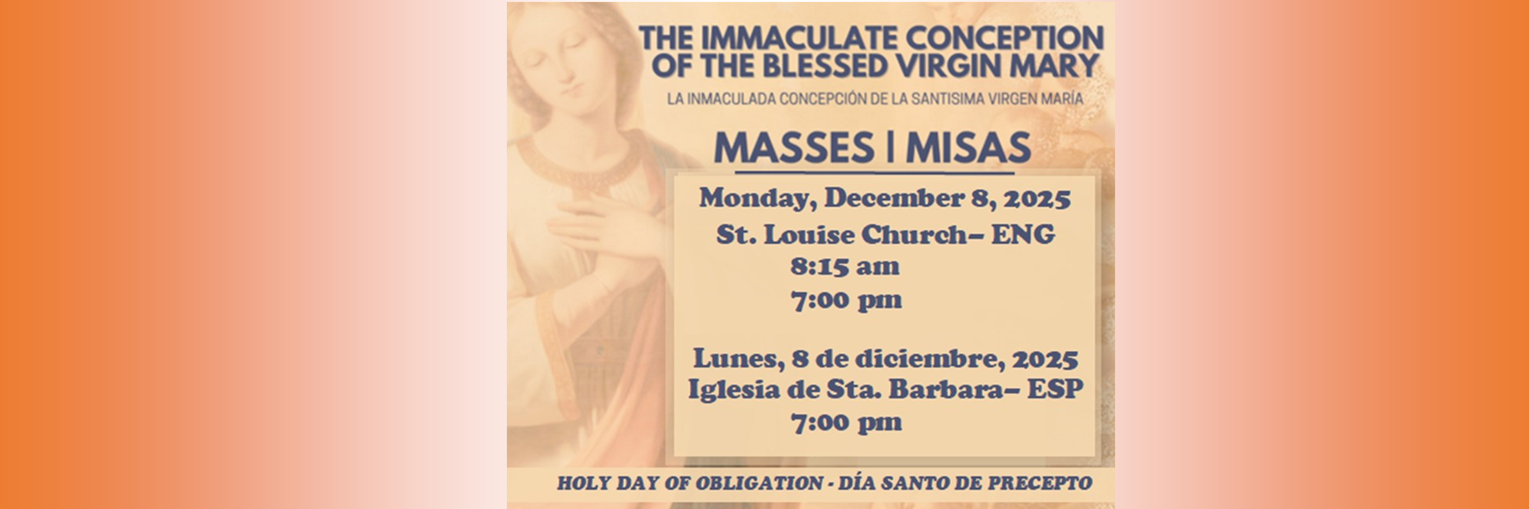 MASS SCHEDULE- St. Louise: Sat. 5pm, Sun. 9:30am - St. Barbara: Sunday 8am, 11am, 12:30pm-Spanish